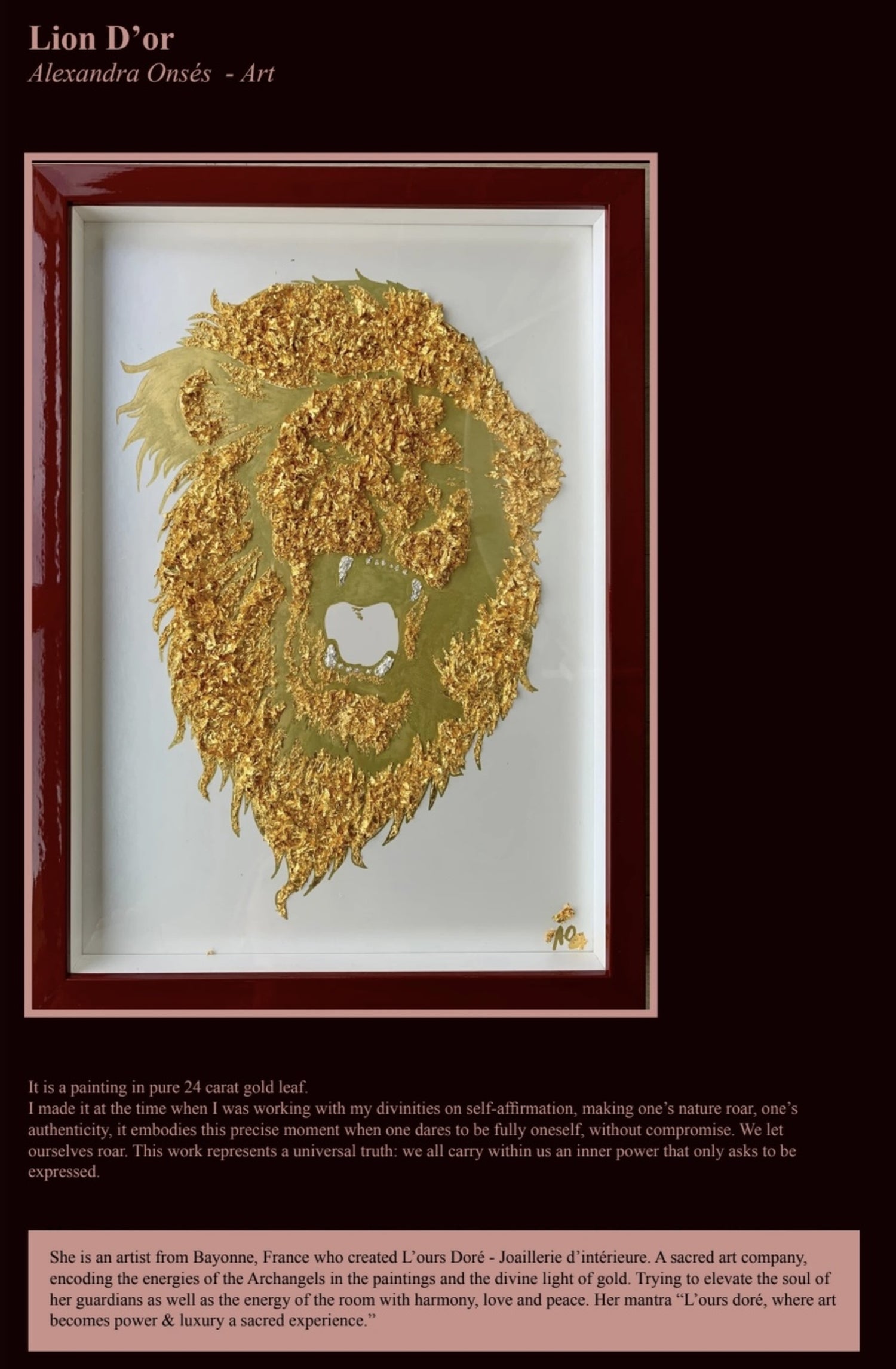 Artiste originaire de Bayonne, France, elle a fondé L’Ours Doré – Joaillerie d’intérieure, une maison d’art sacré qui encode l’énergie des Archanges dans ses œuvres, illuminées par la lumière divine de l’or. À travers son art, elle cherche à élever l’âme de ses gardiens ainsi que l’énergie des lieux, en apportant harmonie, amour et paix.