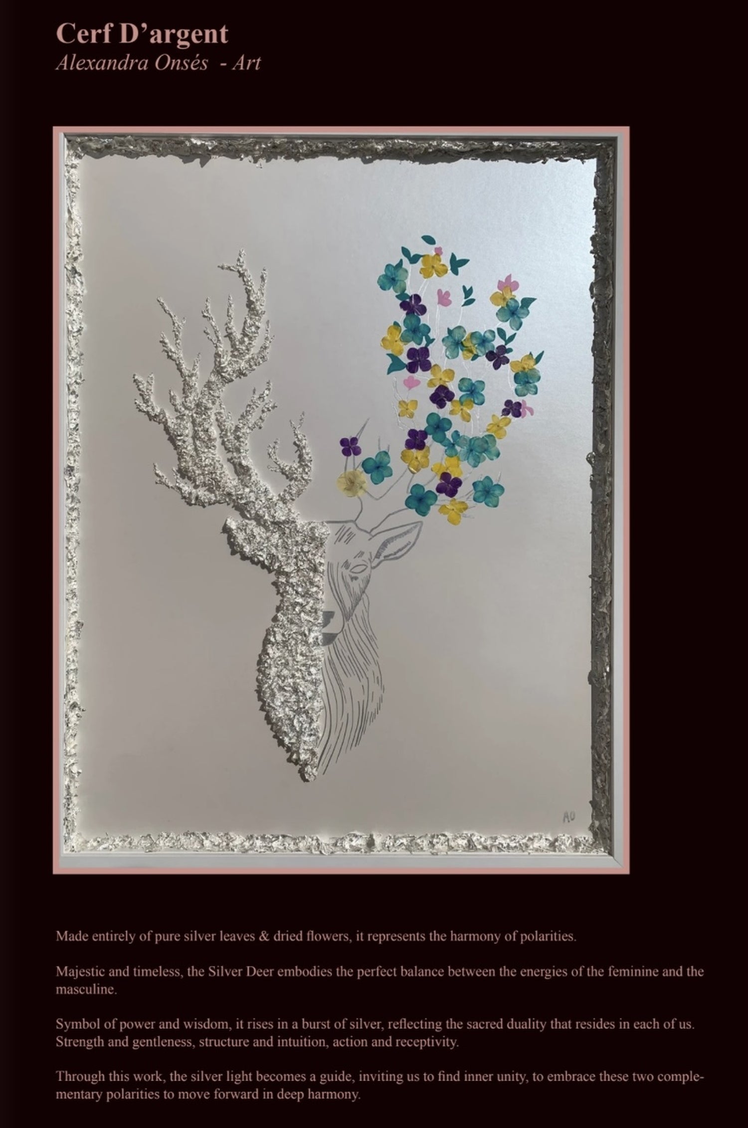Entièrement réalisé en feuilles d’argent pur et fleurs séchées, ce tableau représente l’harmonie des polarités.