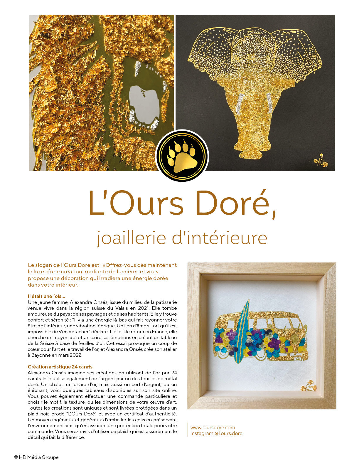 Alexandra Onsés imagine ses créations en utilisant de l'or pur 24 carats. Elle utilise également de l'argent pur ou des feuilles de métal doré. Un chalet, un phare d'or, mais aussi un cerf d'argent, ou un éléphant, voici quelques tableaux disponibles sur son site. Vous pouvez également effectuer une commande particulière et choisir le motif, la texture, ou les dimensions de votre œuvre d'art. Toutes les créations sont uniques et sont livrées protégées dans un plaid noir, brodé "L'Ours Doré" et avec un certificat d'authenticité. Un moyen ingénieux et généreux d'emballer les colis en préservant l'environnement ainsi qu'en assurant une protection totale pour votre commande. Vous serez ravis d'utiliser ce plaid, qui est assurément le détail qui fait la différence.